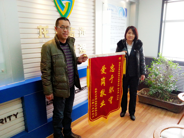 2015年1月份,一位八十多歲高齡的老人到張家口市商業(yè)銀行某支行辦理取錢業(yè)務(wù)時,因老人年事已高患有老年病,與銀行的工作人員發(fā)生了沖突,無論工作人員如何解釋,仍無法溝通,至此,老人經(jīng)常到該行找工作人員滋事,老人的行為嚴重影響到支行的正常業(yè)務(wù),為客戶辦理業(yè)務(wù)帶來了不便,為維護好銀行正常秩序,我公司派駐支行的保安隊員顧龍液、王文來,主動接近老人進行勸阻,交流溝通,問寒問暖,緩解老人心態(tài)。之后我公司曹文平隊長得知此事,也趕到支行協(xié)助處理,幫忙找到了老人的家人,在家人的勸說下,老人離開了支行,支行恢復了正常的工作秩序。經(jīng)過此事,我公司保安大隊長曹文平及派駐到張家口市商業(yè)銀行的保安隊員顧龍液、王文來受到了張家口市商業(yè)銀行支行領(lǐng)導的高度贊揚,特到我公司送來了錦旗與表揚信,對我公司進行感謝。